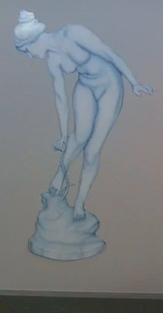 example above of the relationship between painted, shaped metal images and rubber stamps on wall opposite. This image, which is appropriated from an illustration of a sculpture in a Royal Academy picture book from 1893, was first painted on the shaped aluminium. It was then photographed with a digital camera and converted to the black and white embossed version with a computer graphic program. The resulting pixilated image was in turn scanned by a machine that guides a laser which cuts the rubber stamp. The final print is made using stamp-pad ink on laid note paper. [The naivety in explaining the technology used is because this was written in 1998]